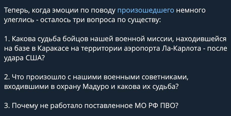 Можно предположить то. Какими могут оказаться ответы на них. Вчера мы описывали судьбу 32-х кубинских товарищей, которые тоже входили в команду охраны Мадуры и теперь их ждут пышные похороны на родине. Вполне возможно, что российские специалисты попали в тот же самый замес. Но здесь – все просто.