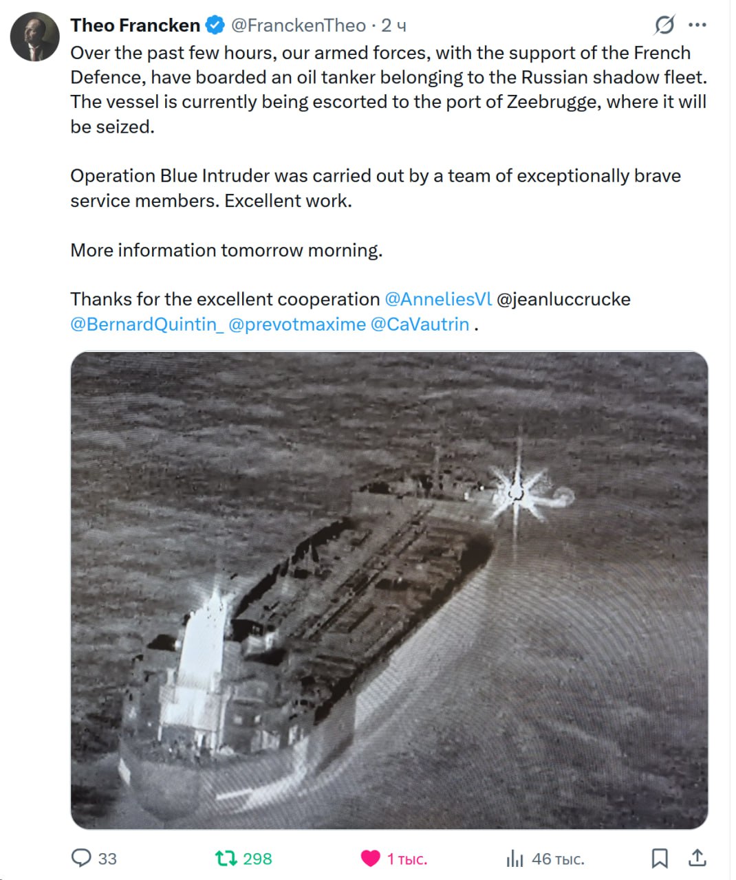 «Наши вооруженные силы при поддержке французского оборонного ведомства поднялись на борт нефтяного танкера, принадлежащего российскому теневому флоту. Судно в настоящее время сопровождают в порт Зебрюгге, где оно будет конфисковано», — говорится в сообщении.